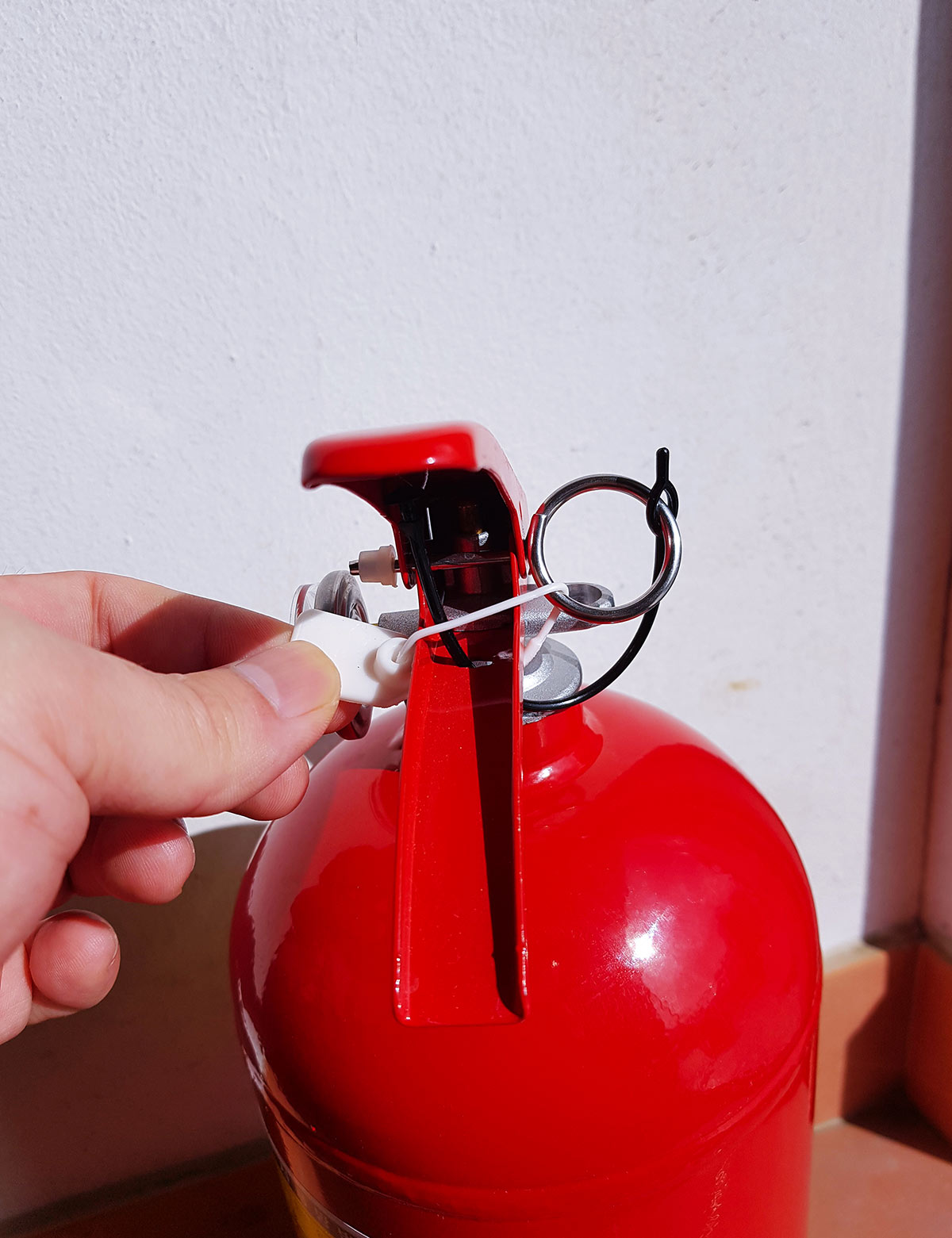 A close-up of the fire extinguisher's safety pin, securely held in place by a plastic seal.