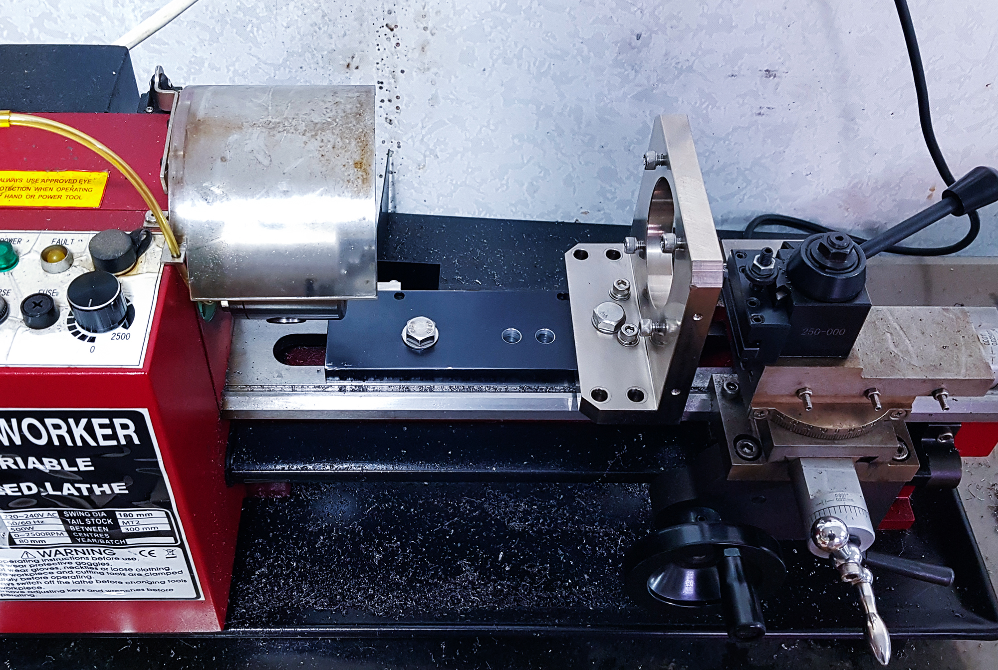 To use this method, you need a few things. First, a way to securely mount the motor. I threw together a custom-made attachment for my lathe that holds a standard 750W servo motor perfectly.