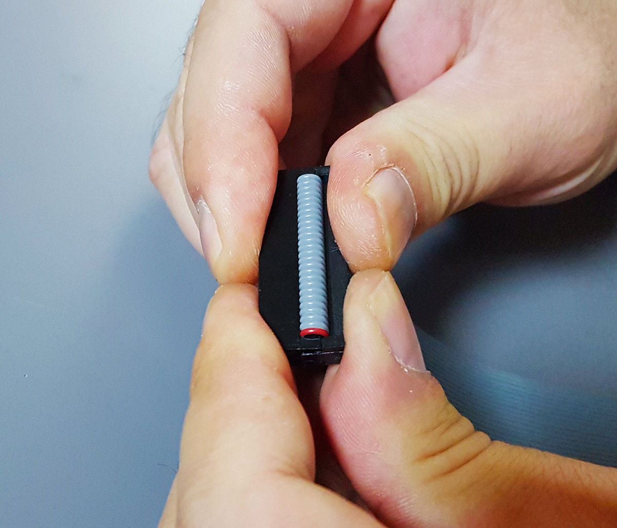 Place the ribbon cable between the connector body and the cover. Make sure Wire 1 (the red stripe) is aligned with the Pin 1 (▼) mark. A useful tip is to gently press the cover down with your fingers. It will lightly grip the cable, holding it in place so it doesn’t shift around before crimping.