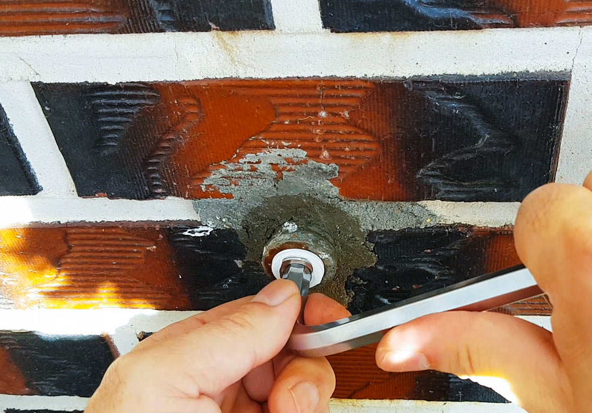 A close-up of a hand tightening the stainless hex plug into the wall fitting using a hex key (Allen wrench).