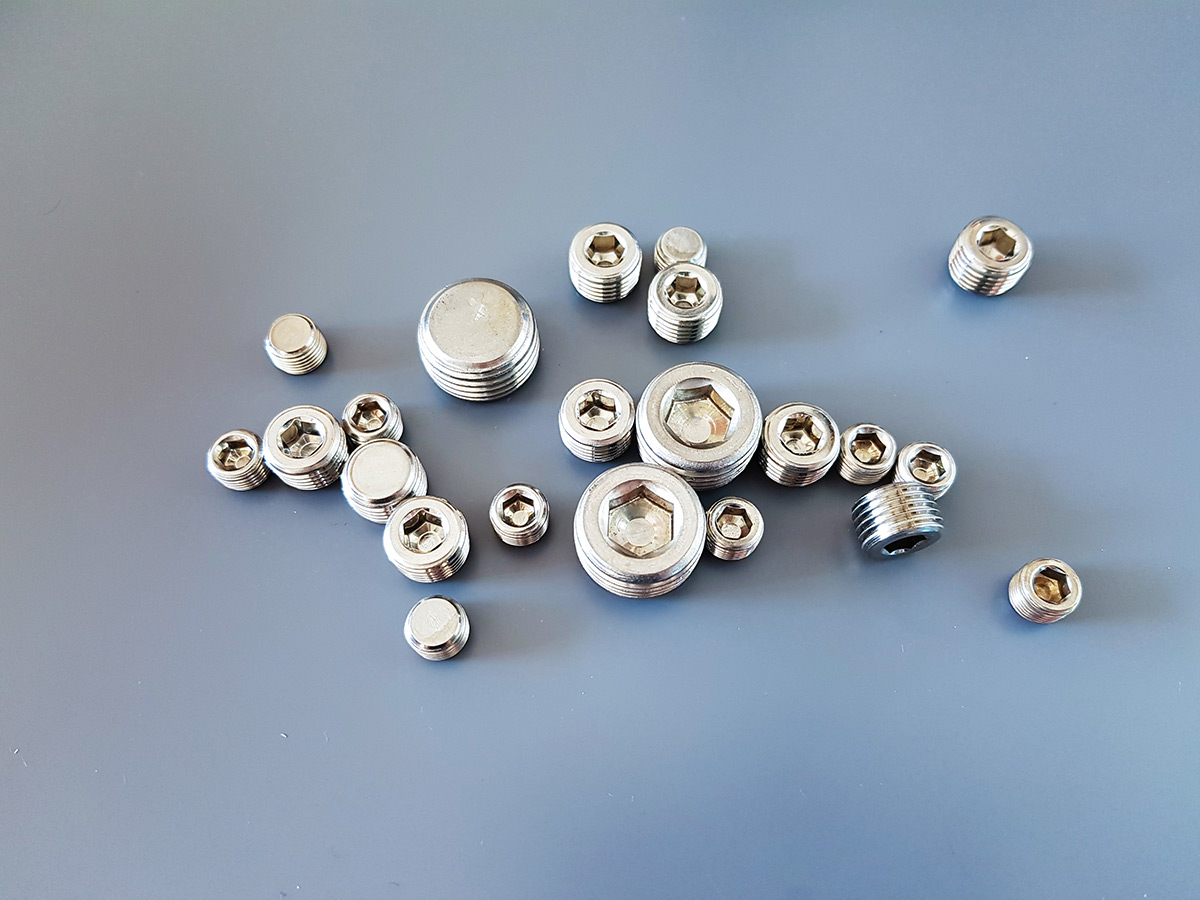 A collection of various sized Stainless Steel Hex Socket Plugs.