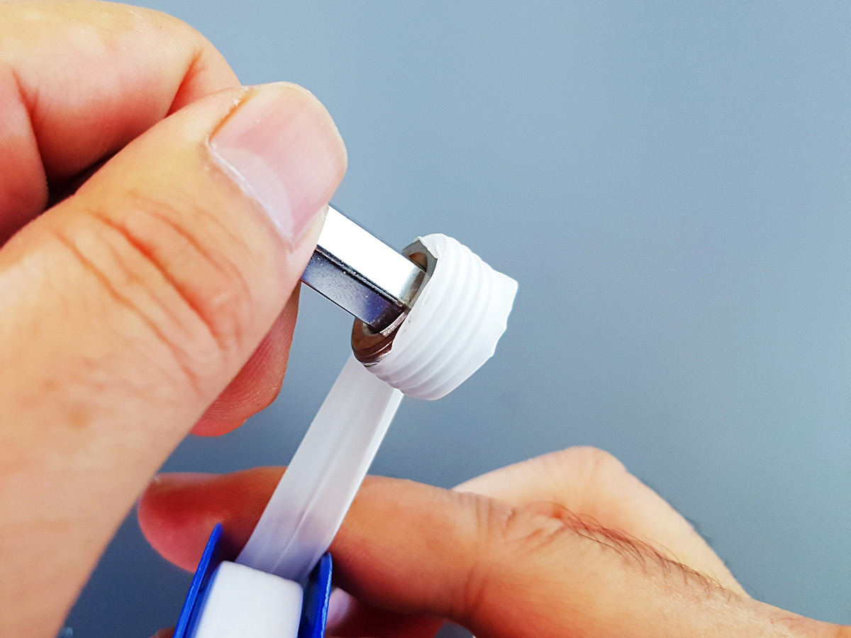 A close-up of a hand wrapping white Teflon tape around the threads of a stainless hex plug. The tape is wrapped neatly in the direction of tightening.