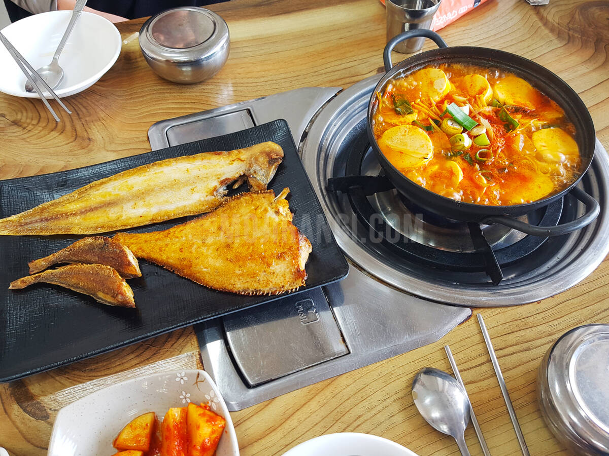 After our 3-4 km walk, we were getting hungry. Here’s a great tip: most restaurants near the beach have a deal with the public parking lot. We found that if you spend over 10,000 KRW (about $7 USD) at a participating restaurant, you get 2 hours of free parking. We tried a local spot and had a fantastic seafood soft tofu stew and grilled fish platter. It really hit the spot